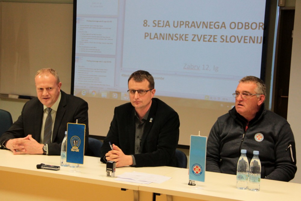 Generalni direktor Policije Marjan Fank, predsednik Planinske zveze Slovenije Bojan Rotovnik in predsednik Gorske reševalne zveze Slovenije Igor Potočnik so na 8. seji UO PZS podpisali letni načrt sodelovanja PZS in GRZS s Policijo. (foto Manca Čujež)