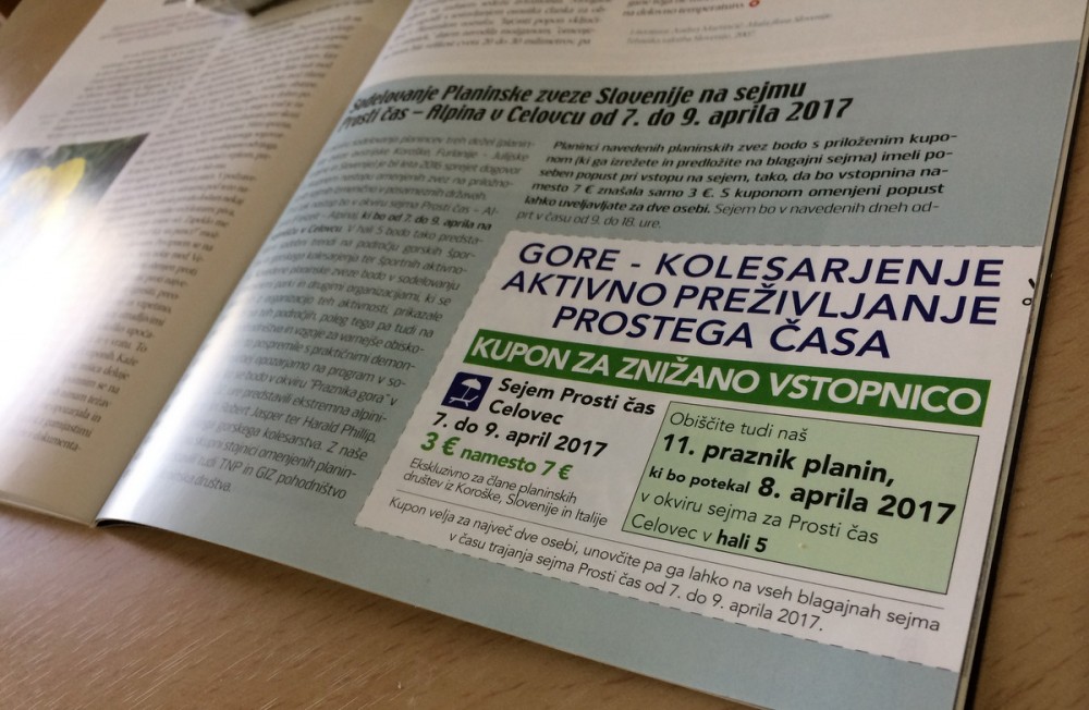 Planinci navedenih planinskih zvez bodo s kuponom, ki ga najdete v aktualni številki Planinskega vestnika, ga izrežete in predložite na blagajni sejma, imeli poseben popust pri vstopu na sejem, tako da bo vstopnina namesto 7 € znašala samo 3 €. S kuponom omenjeni popust lahko uveljavljate za dve osebi. Sejem bo v navedenih dneh odprt v času od 9. do 18. ure.