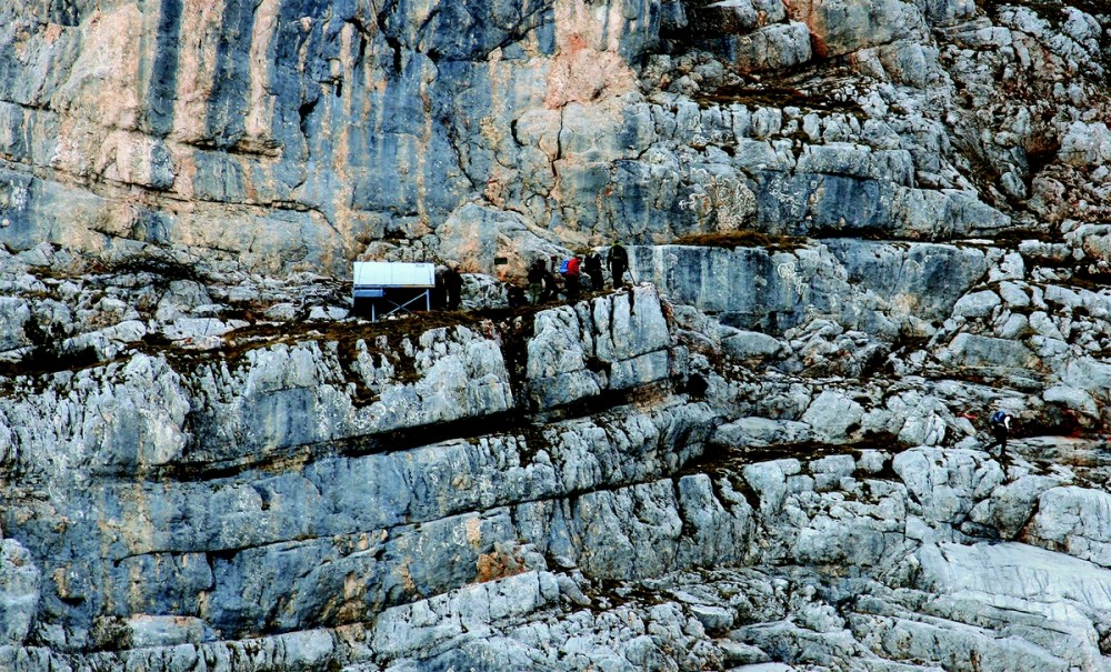 Zimska soba Slavka Svetičiča - Slavca pri Domu Petra Skalarja na Kaninu (Ofis arhitekti 2016) je primer nesmiselno postavljenega objekta, ki je zaradi pričakovane preobleganosti s strani smučišča zaklenjen in kot zavetišče neuporaben. Foto: Bojan Rotovnik