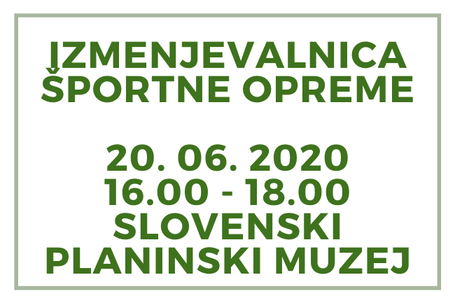 sobota, 13. junij 2020 ob 15:00, ogledov: 6724 Zgodovinska oprema sodi v muzej, nepoškodovana in čista pa na izmenjevalnico!| Objavil(a): Barbara Gradič Oset | | V Slovenskem planinskem muzeju vas vabijo, da podarite ali zamenjate športno opremo, ki je ne potrebujete več. Opremo že zbirajo, lahko pa jo prinesete tudi na dan izmenjevalnice. | | Dodatne informacije: