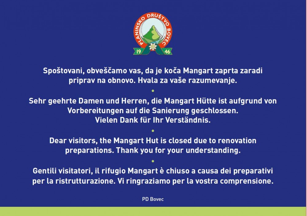 sreda, 16. julij 2025 ob 06:30, ogledov: 1013 Koča na Mangrtskem sedlu zaprta zaradi priprav na obnovoPlaninsko društvo Bovec | | | Objavil(a): Manca Ogrin | | Planinsko društvo Bovec obvešča, da je Koča na Mangrtskem sedlu (1906 m) zaprta zaradi priprav na obnovo - in se zahvaljuje za razumevanje. |  |